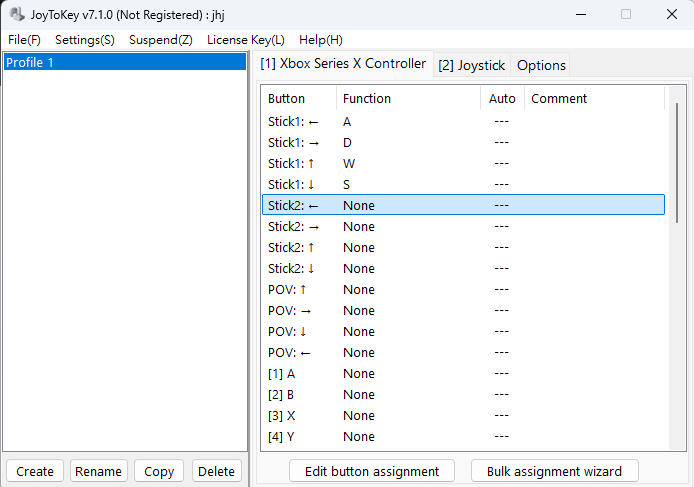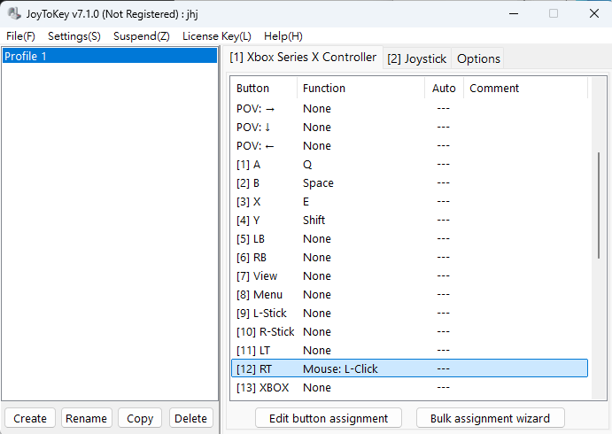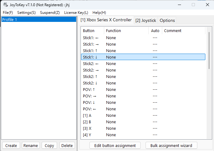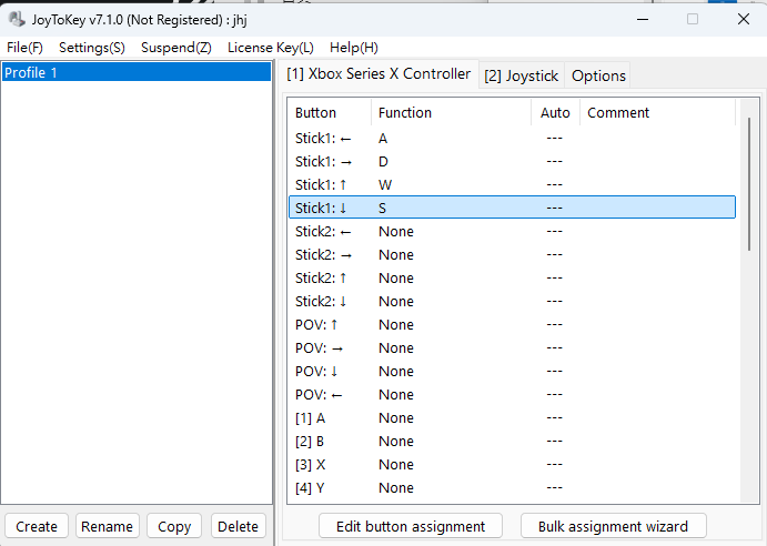 請先注意 手把要先記得跟電腦連接上,JoyToKey 那邊就會跳出 對應手把(像圖片中的 Xbox Series X Controller)