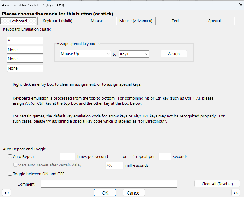 3.Stick1 代表左類比(而 第五人格控制人物移動是 WASD) 所以,我只要把 左類比上下左右 對應成 鍵盤的 WASD 即可。直接對著 點兩下 會變成這樣的視窗(這是設置視窗),