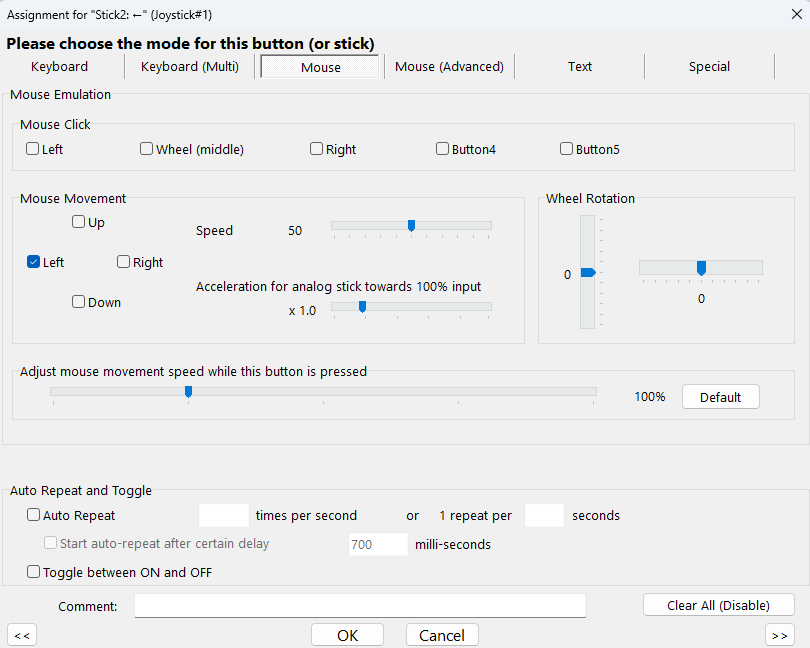 3.Stick2 代表右類比(而 第五人格控制人物視角是 滑鼠) 所以,我只要把 右類比上下左右 對應成 鍵盤的 滑鼠上下左右 即可。直接對著 點兩下 會變成這樣的視窗(這是設置視窗),只是 原本是 Keyboard 要改成 Mouse(滑鼠),再來是 注意 Mouse Movement (鼠標移動方向),鼠標往左 那就是選擇 Left(左邊),勾選好之後 按下OK