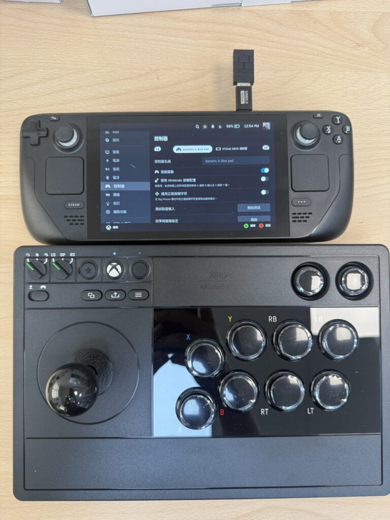圖片中的是 八位堂的 XBOX授權版 格鬥搖桿,可以透過 USB TO TYPEC轉接頭 將 2.4G接收器 插入 STEAM DECK,然後 按壓 格鬥搖桿的 LOGO鍵(XBOX) 啟動格鬥搖桿,就能配對上,等一下 就會能用 格鬥搖桿操控。